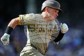 San Diego Padres' Luis Arraez reacts after hitting a single during the first inning of Game 2 of a National League wild card baseball game against the Chicago Cubs Wednesday, Oct. 1, 2025, in Chicago. (AP Photo/Erin Hooley)