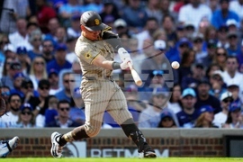 San Diego Padres' Luis Arraez hits a single during the seventh inning of Game 2 of a National League wild card baseball game against the Chicago Cubs Wednesday, Oct. 1, 2025, in Chicago. (AP Photo/Nam Huh)