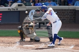 Chicago Cubs' Kyle Tucker hits a single during the ninth inning of Game 2 of a National League wild card baseball game against the San Diego Padres Wednesday, Oct. 1, 2025, in Chicago. (AP Photo/Nam Huh)