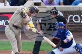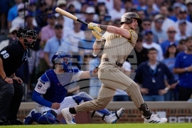 San Diego Padres' Ryan O'Hearn hits a single during the fourth inning of Game 2 of a National League wild card baseball game against the Chicago Cubs Wednesday, Oct. 1, 2025, in Chicago. (AP Photo/Erin Hooley)