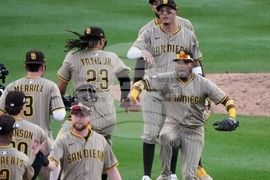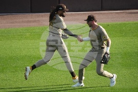 San Diego Padres' Luis Arraez and Jake Cronenworth celebrate after Game 2 of a National League wild card baseball game against the Chicago Cubs Wednesday, Oct. 1, 2025, in Chicago. (AP Photo/Nam Huh)