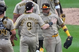 San Diego Padres' Luis Arraez and Manny Machado celebrate after Game 2 of a National League wild card baseball game against the Chicago Cubs Wednesday, Oct. 1, 2025, in Chicago. (AP Photo/Erin Hooley)