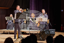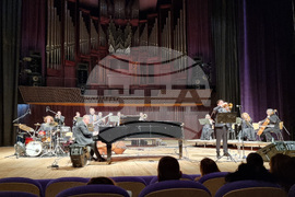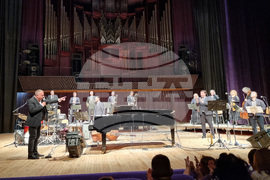 Варна (1 октомври 2025) Ангел Заберски представя своя албум „Изповед на един син” във Фестивалния комплекс във Варна. Солисти са тромпетистът Михаил Йосифов (вляво), кавалджията Недялко Недялков, Стоян Янкулов-Стунджи на ударни и Борис Таслев - бас.
