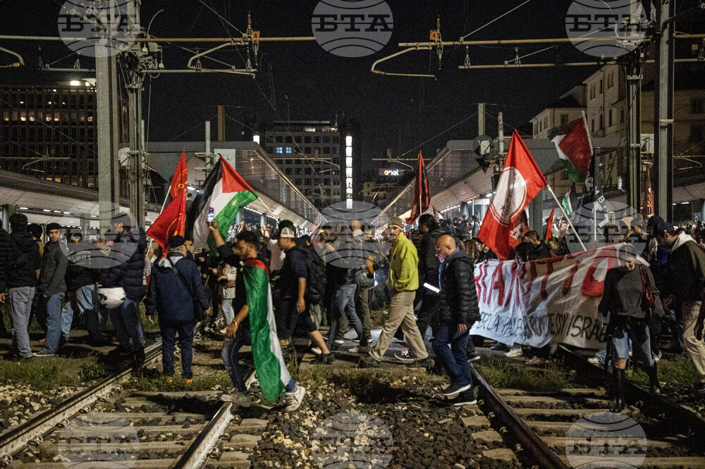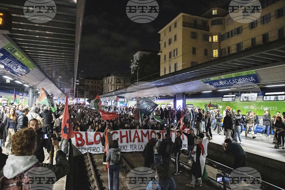 Pro-Palestinian protesters demonstrate at Cadorna train station in solidarity with the Global Sumud Flotilla on Wednesday, Oct. 1, 2025, in Milan, Italy, after ships were intercepted by the Israeli navy. (Marco Ottico/LaPresse via AP)