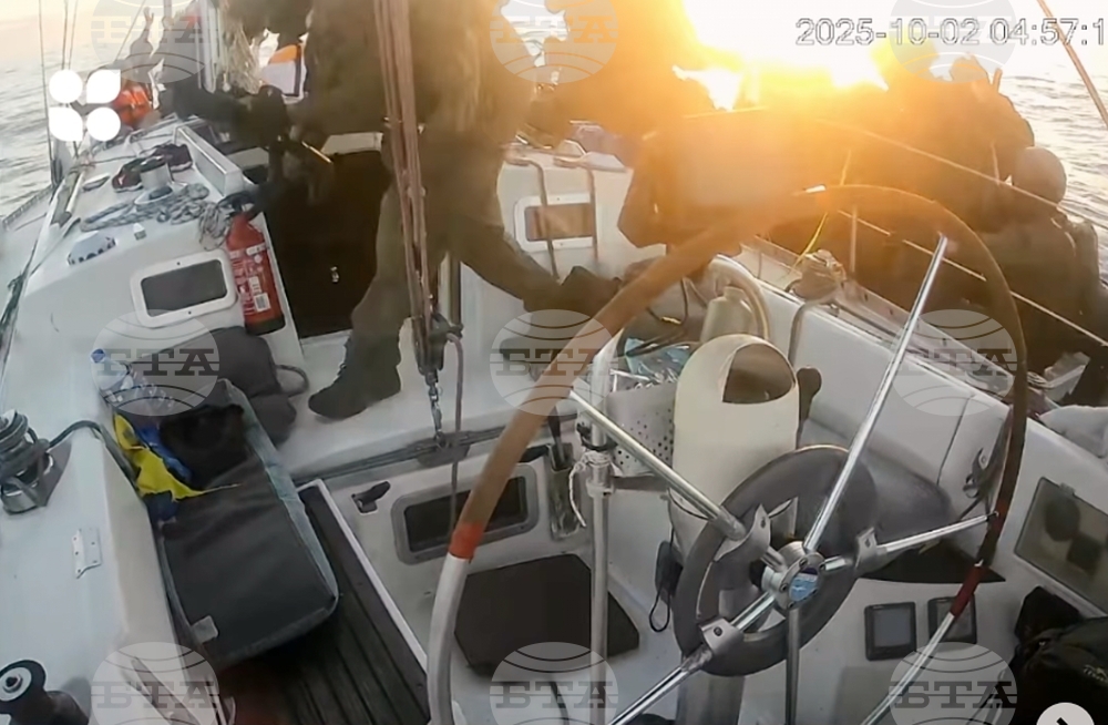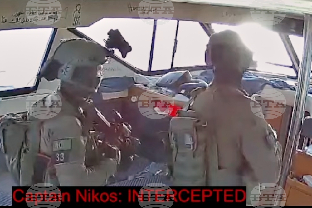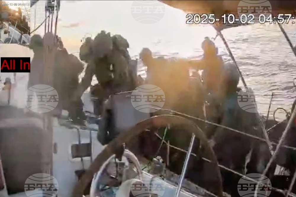 IIsraeli navy soldiers sail one of the boats from the Gaza-bound civilian flotilla Sumud toward the port of Ashdod, Israel, Thursday, Oct. 2, 2025, after it was intercepted approaching the Gaza coast. (AP Photo/Leo Correa)