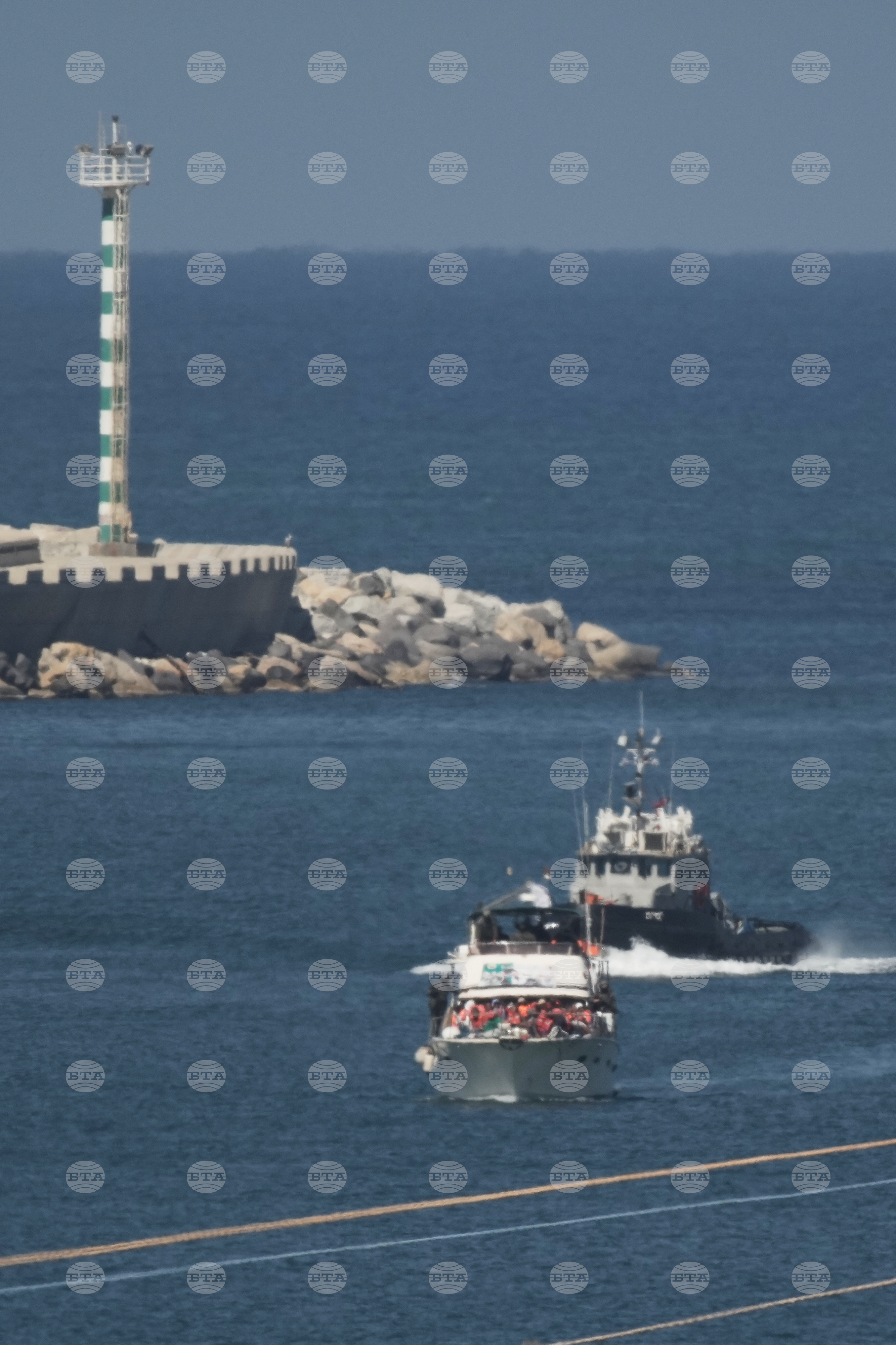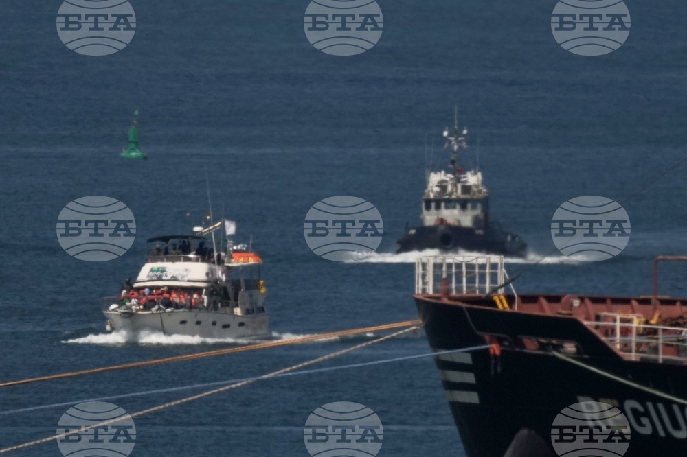 Gaza-bound Sumud flotilla boats sail into the port of Ashdod, Israel, Thursday, Oct. 2, 2025, after being intercepted by Israeli navy soldiers approaching the Gaza coast. (AP Photo/Leo Correa)