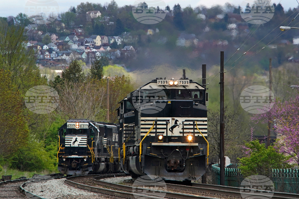 FILE - A Norfolk Southern freight train passes a train on a siding as it approaches a crossing in Homestead, Pa, April 27, 2022. (AP Photo/Gene J. Puskar, File)
