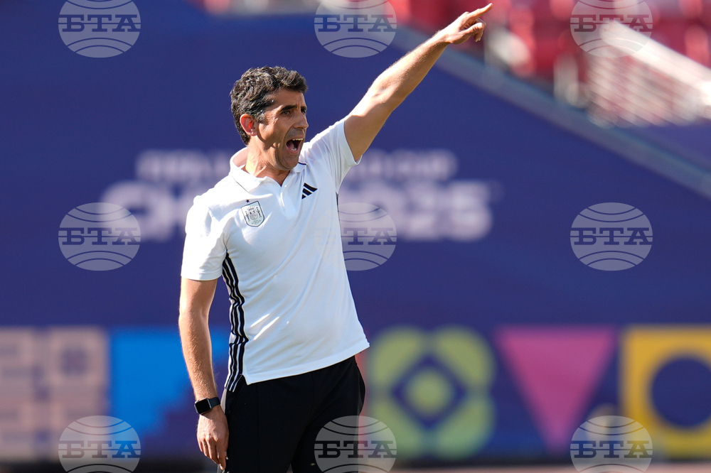 Spain's coach Francisco Gallardo reacts during a FIFA U-20 World Cup Group C soccer match against Mexico at National Stadium in Santiago, Chile, Wednesday, Oct. 1, 2025. (AP Photo/Matias Delacroix)