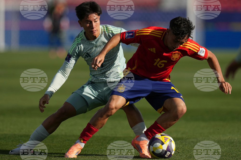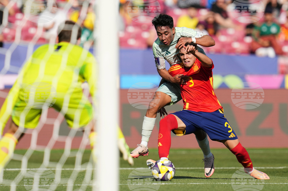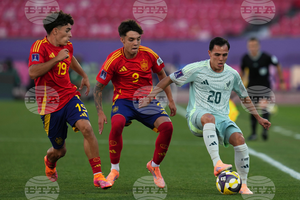Mexico's Cesar Bustos, right, and Spain's Jan Virgili battle for the ball during a FIFA U-20 World Cup Group C soccer match at National Stadium in Santiago, Chile, Wednesday, Oct. 1, 2025. (AP Photo/Esteban Felix)