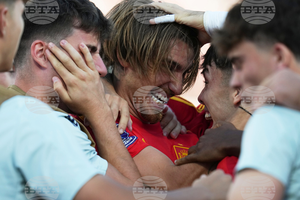 Spain's Iker Bravo, center, celebrates scoring his side's second goal against Mexico from the penalty spot during a FIFA U-20 World Cup Group C soccer match at National Stadium in Santiago, Chile, Wednesday, Oct. 1, 2025.(AP Photo/Esteban Felix)