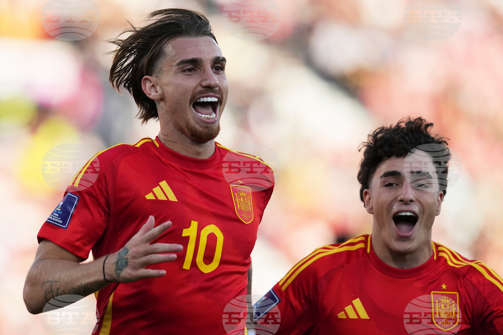 Spain's Pablo Garcia celebrates scoring his side's first goal against Mexico during a FIFA U-20 World Cup Group C soccer match at National Stadium in Santiago, Chile, Wednesday, Oct. 1, 2025. (AP Photo/Matias Delacroix)