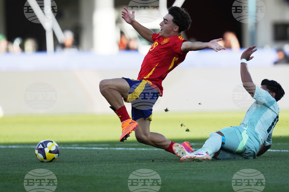 Spain's Andres Cuenca (5) blocks a free kick of Mexico during a FIFA U-20 World Cup Group C soccer match at National Stadium in Santiago, Chile, Wednesday, Oct. 1, 2025. (AP Photo/Esteban Felix)