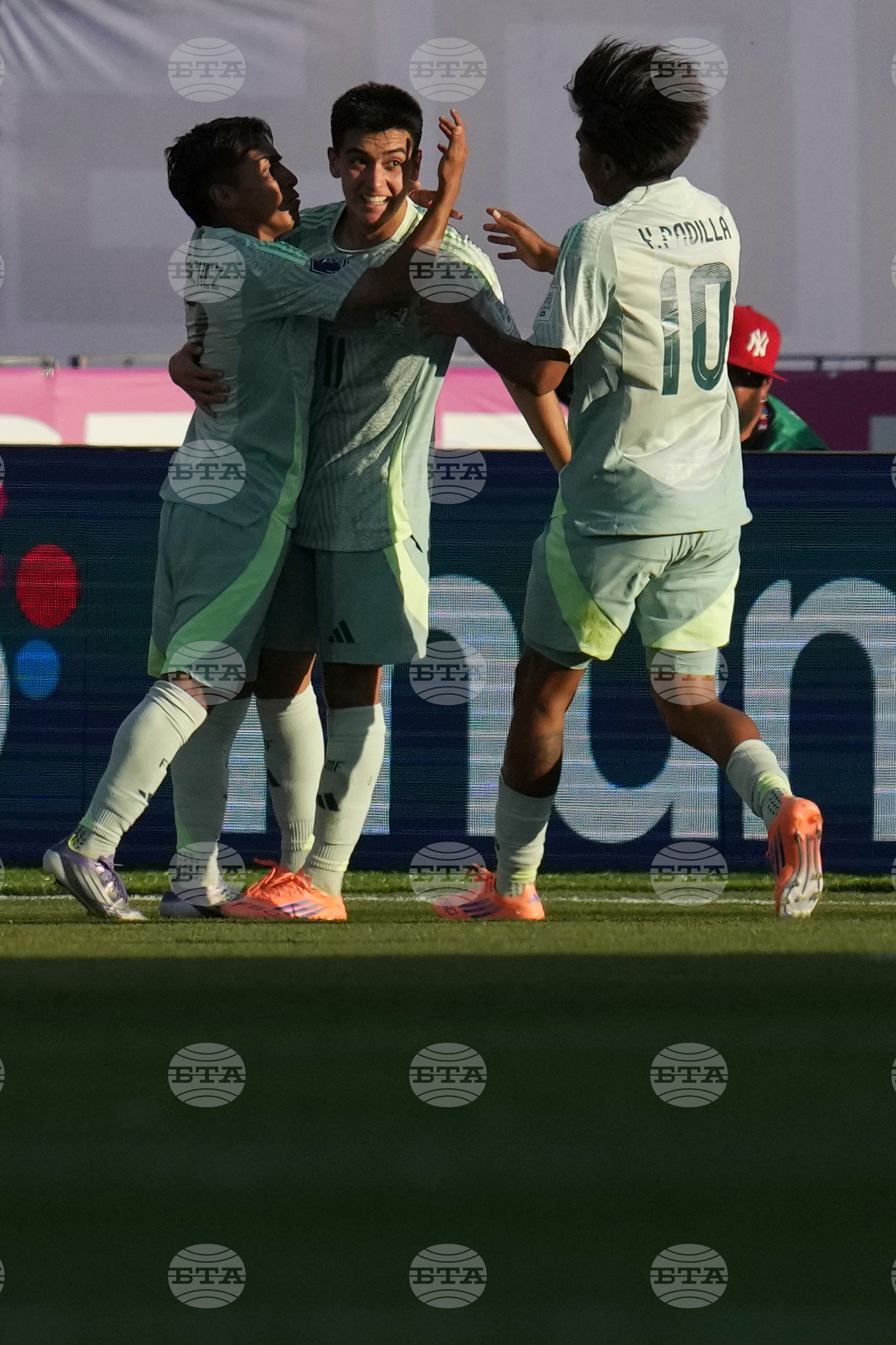 Mexico's Gilberto Mora, center, celebrates scoring his side's second goal against Spain with teammates during a FIFA U-20 World Cup Group C soccer match at National Stadium in Santiago, Chile, Wednesday, Oct. 1, 2025. (AP Photo/Esteban Felix)