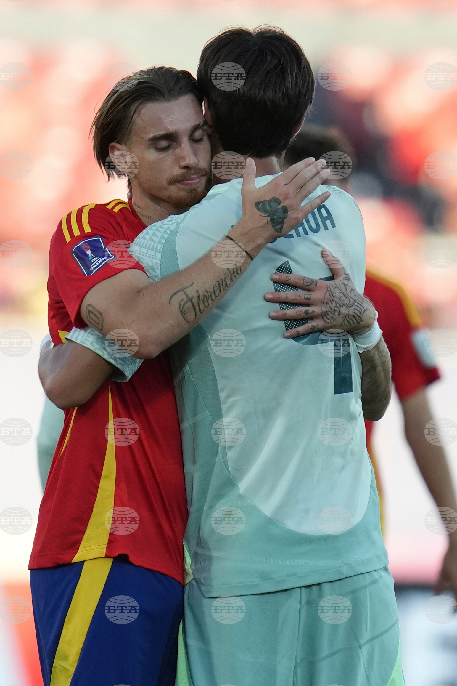 Spain's Iker Bravo, left, embraces Mexico's Diego Ochoa at the end of a FIFA U-20 World Cup Group C soccer match at National Stadium in Santiago, Chile, Wednesday, Oct. 1, 2025. (AP Photo/Esteban Felix)