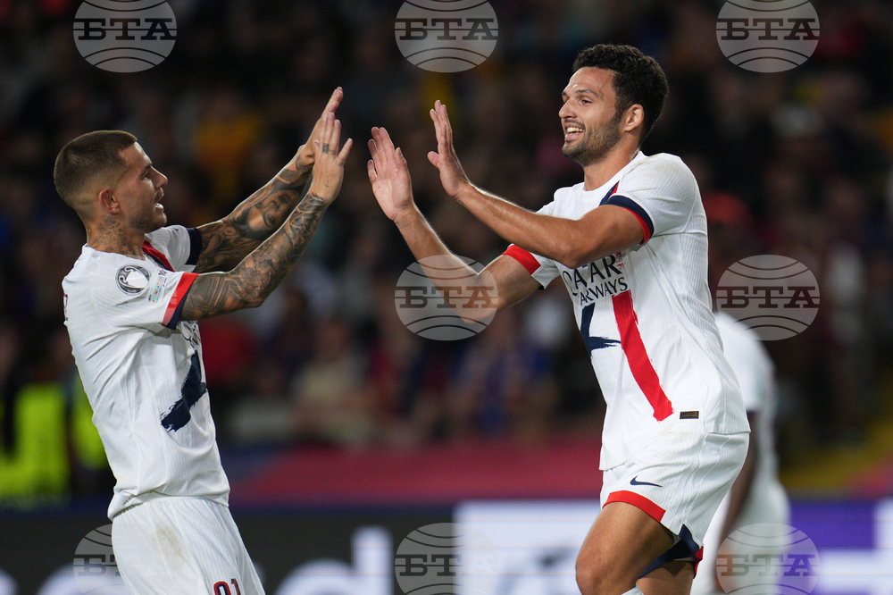 PSG's Goncalo Ramos celebrates after scoring his side's second goal with PSG's Lucas Hernandez during the Champions League opening phase soccer match between Barcelona and Paris Saint-Germain at the Lluis Companys Olympic Stadium in Barcelona, Spain, Wednesday, Oct.1, 2025. (AP Photo/Emilio Morenatti)