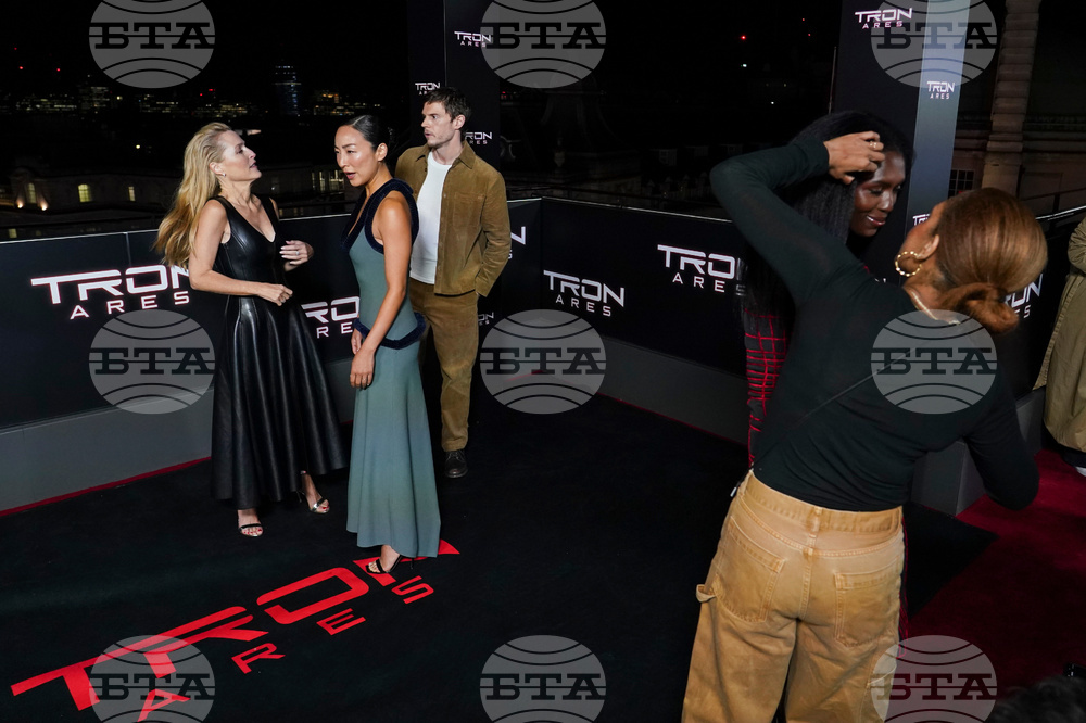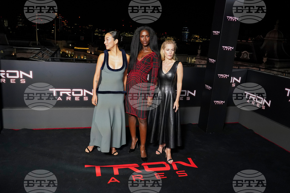 Greta Lee, Jodie Turner-Smith and Gillian Anderson pose for photographers upon arrival at the premiere of the film 'Tron: Ares' on Wednesday, Oct. 1, 2025, in London. (Photo by Alberto Pezzali/Invision/AP)