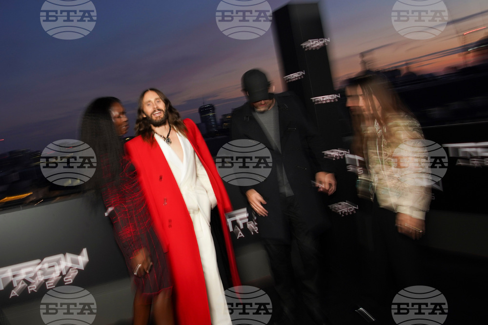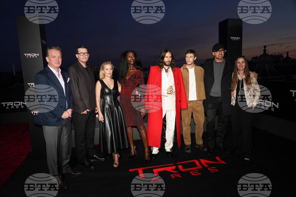 From left to right Sean Bailey, Justin Springer, Gillian Anderson, Jodie Turner-Smith, Jared Leto, Evan Peters, Joachim Rønning and Emma Ludbrook pose for photographers upon arrival at the premiere of the film 'Tron: Ares' on Wednesday, Oct. 1, 2025, in London. (Photo by Alberto Pezzali/Invision/AP)