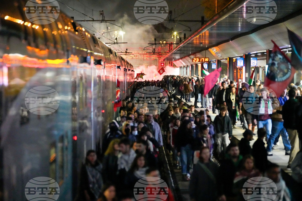 Pro-Palestinian demonstrators flood the rail track at Milan's Cadorna railway station, Italy, late Wednesday, Oct. 1, 2025, after news that a Gaza-bound aid flotilla had been intercepted by Israeli forces in the Mediterranean Sea. (AP Photo/Luca Bruno)