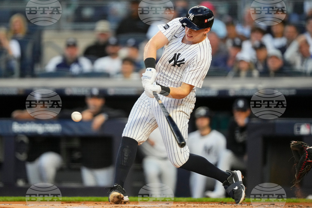New York Yankees Ben Rice (22) connects for a two-run home run against the Boston Red Sox during the first inning of Game 2 of an American League wild-card baseball playoff series, Wednesday, Oct. 1, 2025, in New York. (AP Photo/Yuki Iwamura)