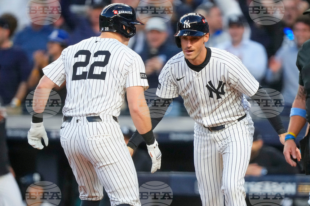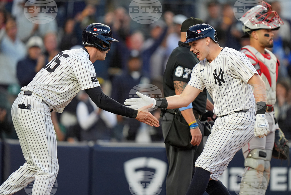 New York Yankees outfielder Cody Bellinger (35) congratulates first base Ben Rice after Rice hit a two-run home run against the Boston Red Sox during the first inning of Game 2 of an American League wild-card baseball playoff series, Wednesday, Oct. 1, 2025, in New York. (AP Photo/Frank Franklin II)