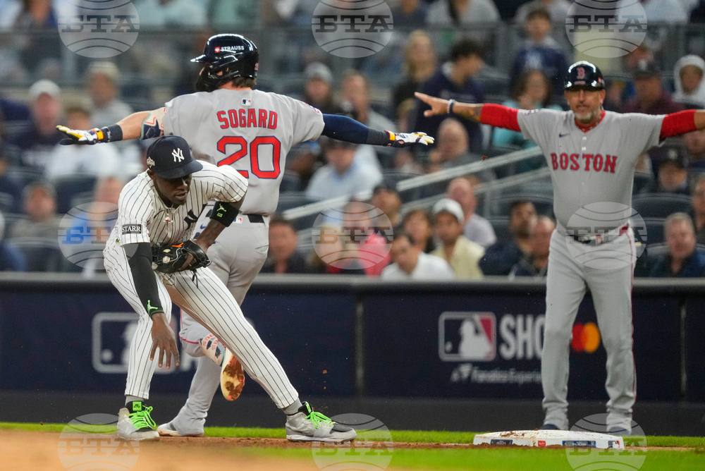 New York Yankees left fielder Cody Bellinger (35) watches as fans catch a solo home run ball hit by Boston Red Sox Trevor Story during the sixth inning of Game 2 of an American League wild-card baseball playoff series, Wednesday, Oct. 1, 2025, in New York. (AP Photo/Frank Franklin II)