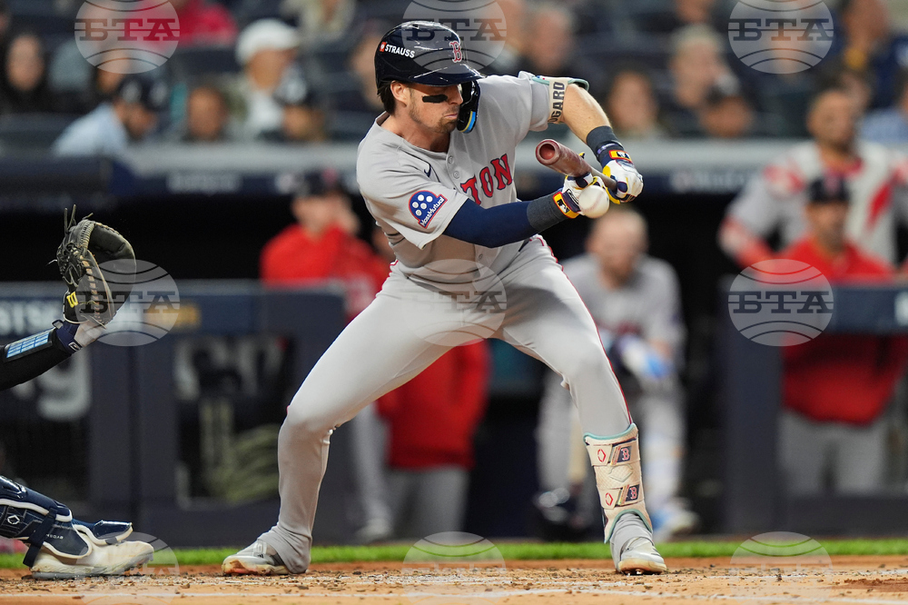 Boston Red Sox first base Nick Sogard lays down a bunt against the New York Yankees during the third inning of Game 2 of an American League wild-card baseball playoff series, Wednesday, Oct. 1, 2025, in New York. (AP Photo/Frank Franklin II)