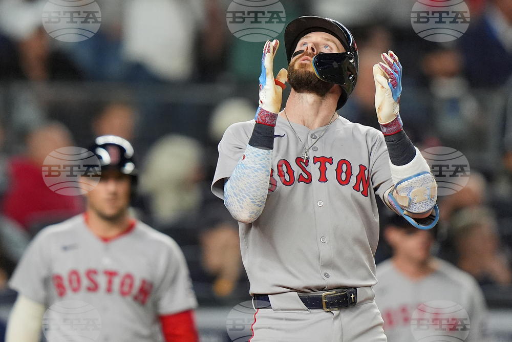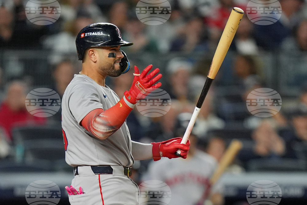Boston Red Sox outfielder Masataka Yoshida warms up before playing against the New York Yankees in Game 2 of an American League wild-card baseball playoff series, Wednesday, Oct. 1, 2025, in New York. (AP Photo/Frank Franklin II)
