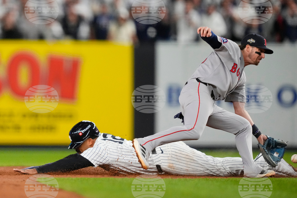 New York Yankees' Trent Grisham (12) steals second base safely ahead of the tag from Boston Red Sox second baseman Nick Sogard (20) during the fifth inning of Game 2 of an American League wild-card baseball playoff series, Wednesday, Oct. 1, 2025, in New York. (AP Photo/Yuki Iwamura)