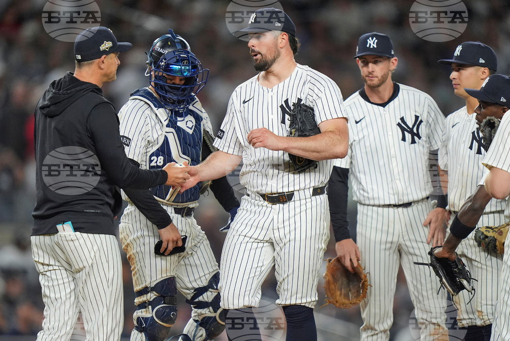 New York Yankees pitcher Carlos Rodón hands the ball to manager Aaron Boone as he leaves the game against the Boston Red Sox during the seventh inning of Game 2 of an American League wild-card baseball playoff series, Wednesday, Oct. 1, 2025, in New York. (AP Photo/Frank Franklin II)