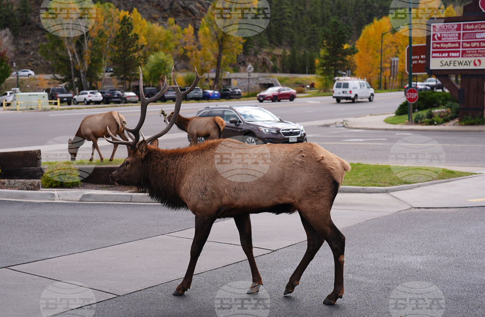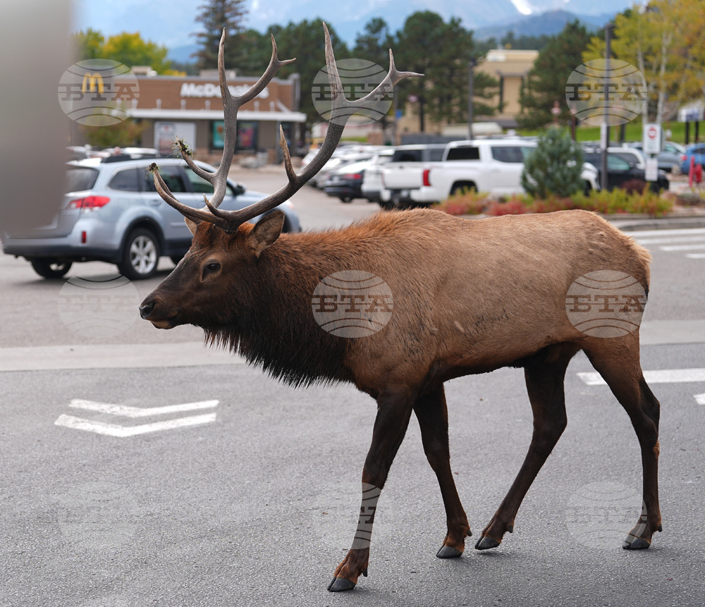 A bull elk walks through the parking lot of a shopping center Wednesday, Oct. 1,2025, in Estes Park, Colo. (AP Photo/David Zalubowski)