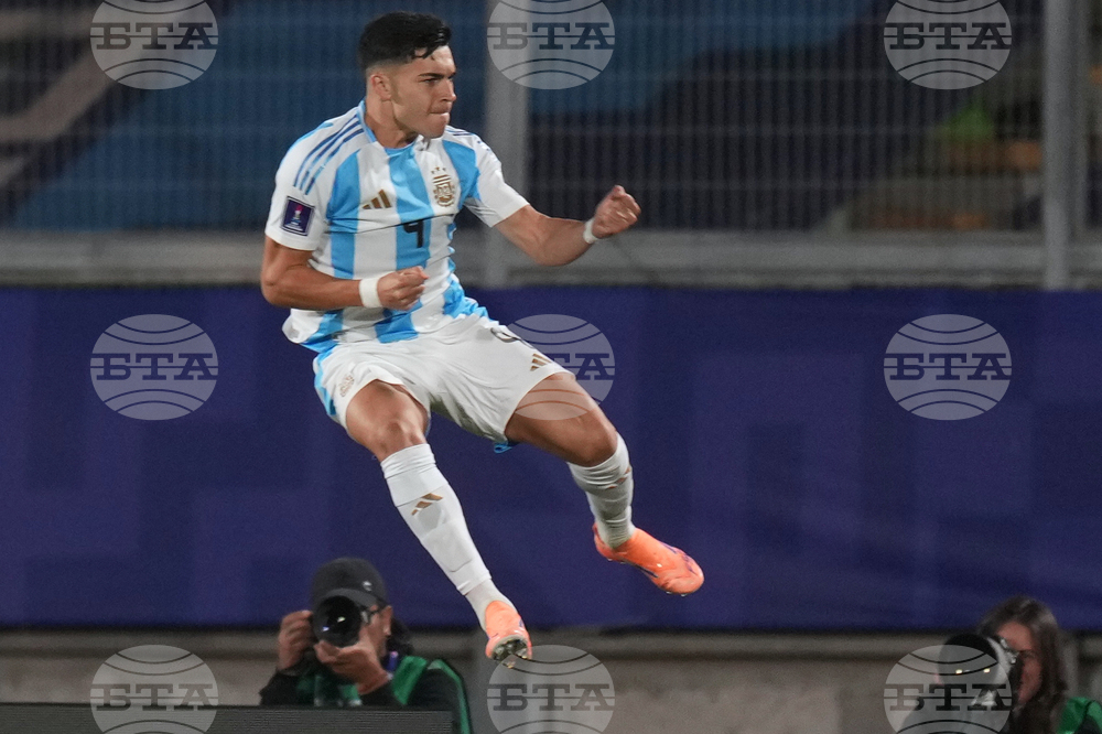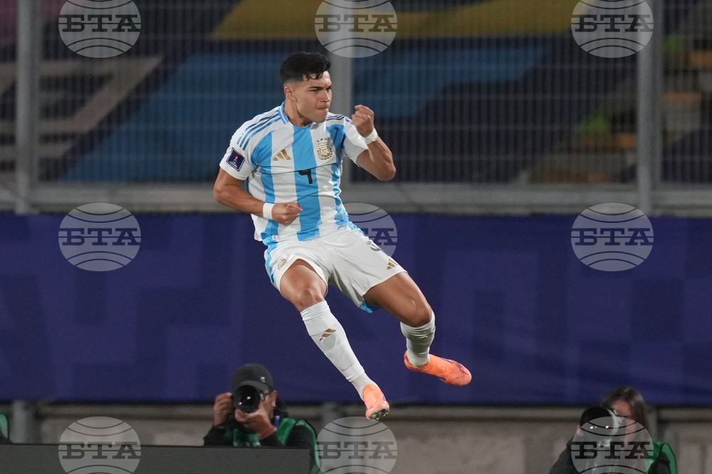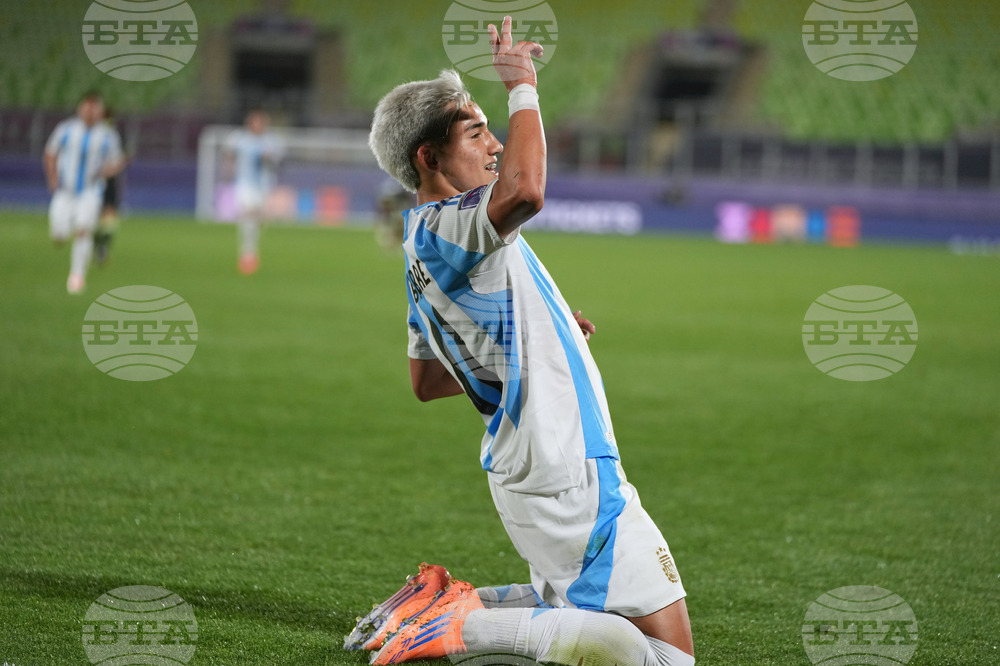 Argentina's Tomas Perez (15) celebrates scoring his side's second goal against Australia during a FIFA U-20 World Cup Group D soccer match at Elias Figueroa Brander Stadium in Valparaiso, Chile, Wednesday, Oct. 1, 2025. (AP Photo/Andre Penner)