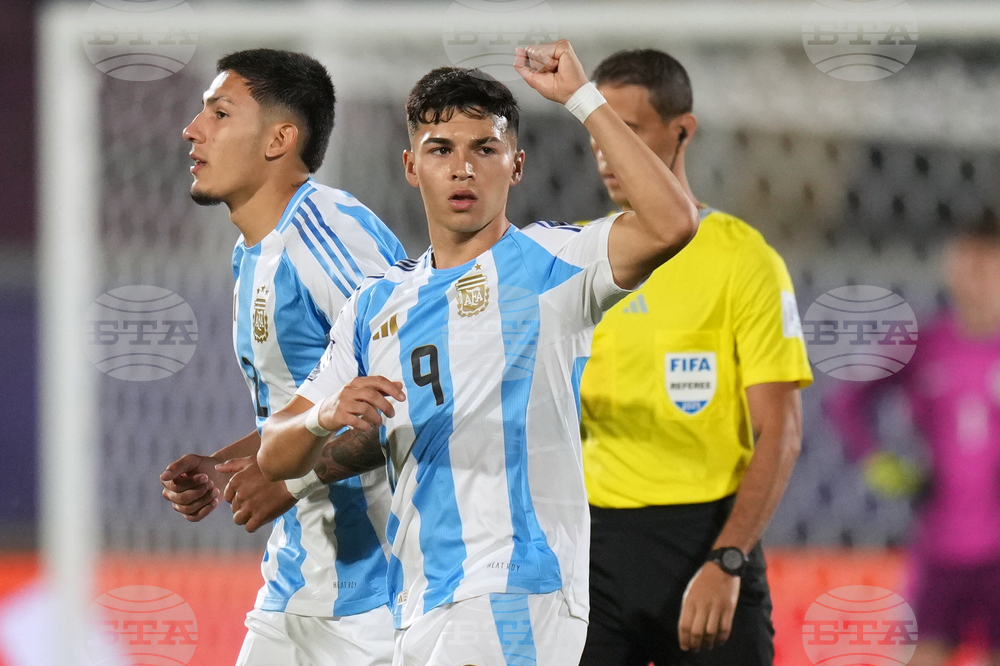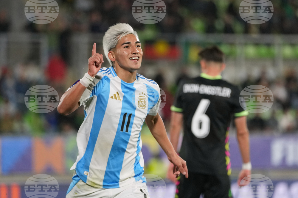 Argentina's Ian Subiabre, right, celebrates scoring his side's third goal against Australia during a FIFA U-20 World Cup Group D soccer match at Elias Figueroa Brander Stadium in Valparaiso, Chile, Wednesday, Oct. 1, 2025. (AP Photo/Andre Penner)