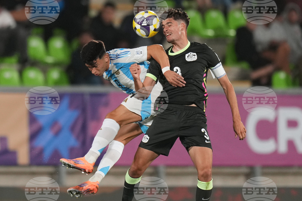 Argentina's Alejo Sarco, left, and Australia's Sebastian Esposito go for a header during a FIFA U-20 World Cup Group D soccer match at Elias Figueroa Brander Stadium in Valparaiso, Chile, Wednesday, Oct. 1, 2025. (AP Photo/Andre Penner)