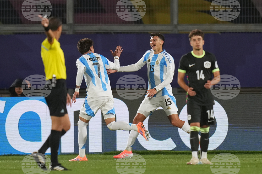 Argentina players walk off the field after their 4-1 win over Australia during a FIFA U-20 World Cup Group D soccer match at Elias Figueroa Brander Stadium in Valparaiso, Chile, Wednesday, Oct. 1, 2025. (AP Photo/Andre Penner)
