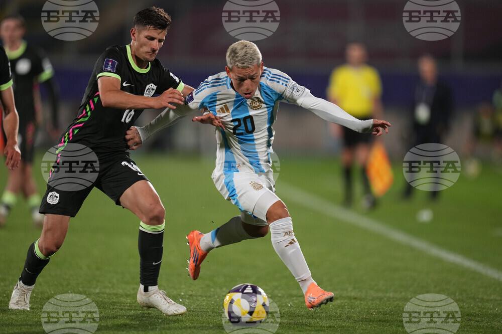 Argentina's Valente Pierani plays the ball during a FIFA U-20 World Cup Group D match against Australia at Elias Figueroa Brander Stadium in Valparaiso, Chile, Wednesday, Oct. 1, 2025. (AP Photo/Andre Penner)