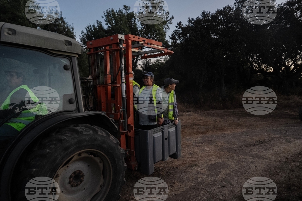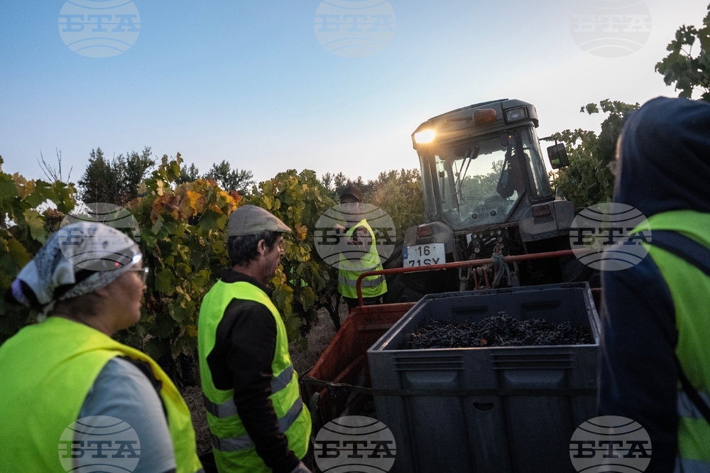 Workers prepare to leave the vineyard at daybreak after working through the night at the Herdade da Fonte Santa vineyard near Vimieiro, Portugal, Wednesday, Sept. 17, 2025. (AP Photo/Ana Brigida)