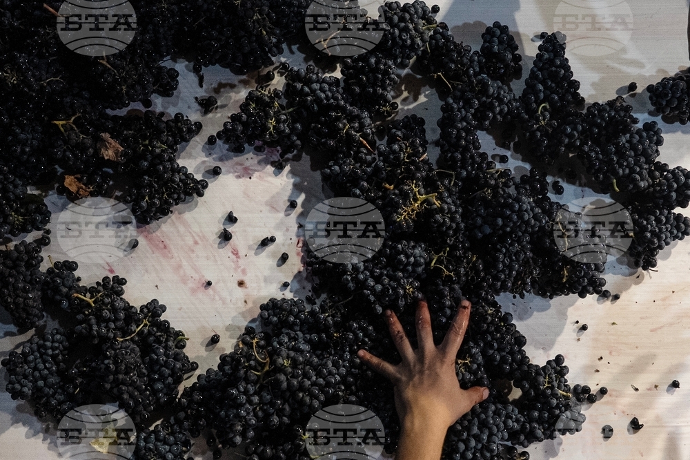 A worker selects grapes at Mainova wine cellar at the Herdade da Fonte Santa vineyard near Vimieiro, Portugal, Wednesday, Sept. 17, 2025. (AP Photo/Ana Brigida)