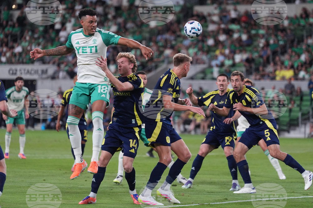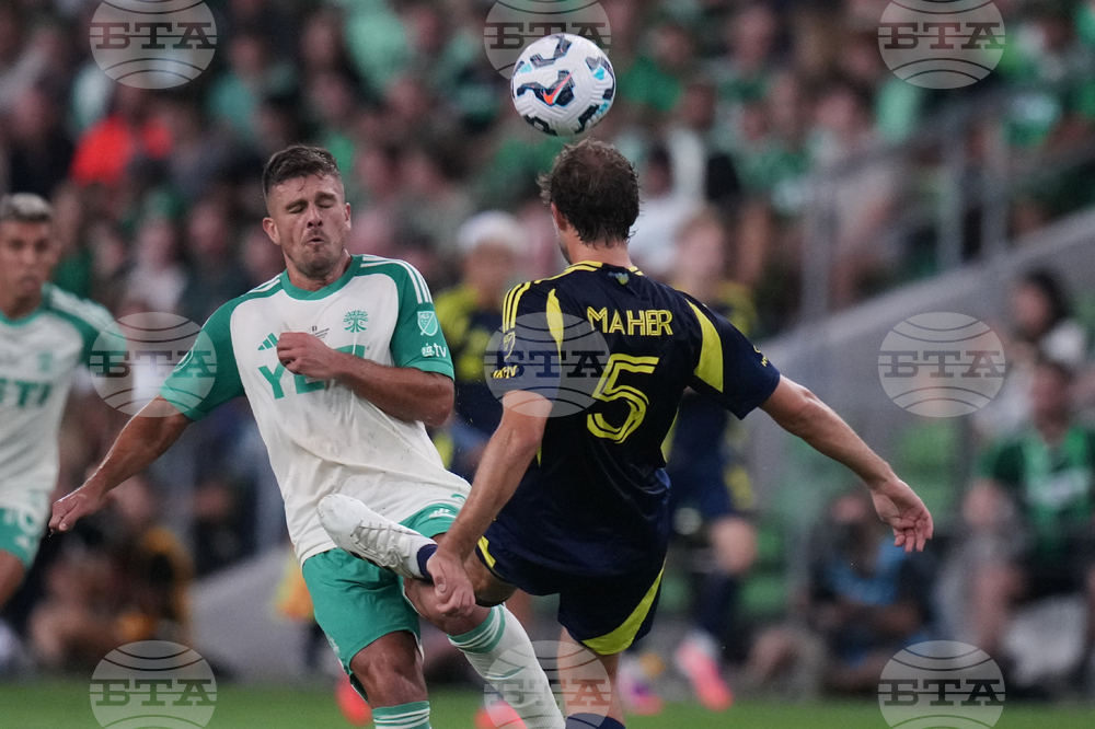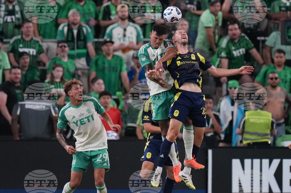 Austin FC defender Julio Cascante, center, and Nashville SC defender Walker Zimmerman, right, leap for a pass during the second half of an U.S. Open Cup final soccer match in Austin, Texas, Wednesday, Oct. 1, 2025. (AP Photo/Eric Gay)