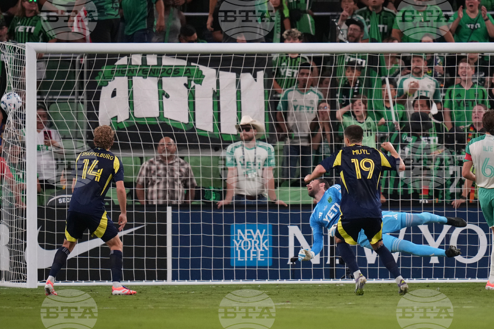 Austin FC midfielder Myrto Uzuni (10) reacts to missing a free shot against Nashville SC during the first half of an U.S. Open Cup final soccer match in Austin, Texas, Wednesday, Oct. 1, 2025. (AP Photo/Eric Gay)