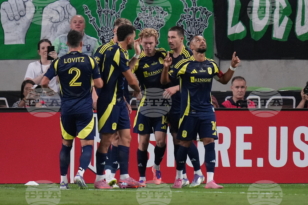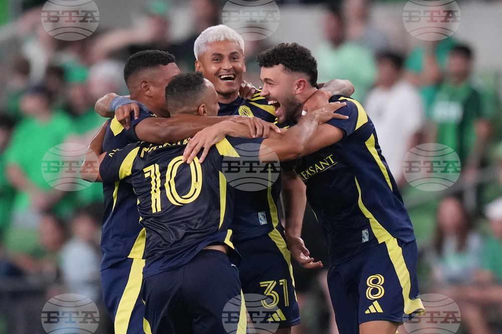 Nashville SC midfielder Hany Mukhtar, center, celebrates with teammates after his goal against Austin FC during the first half of an U.S. Open Cup final soccer match in Austin, Texas, Wednesday, Oct. 1, 2025. (AP Photo/Eric Gay)