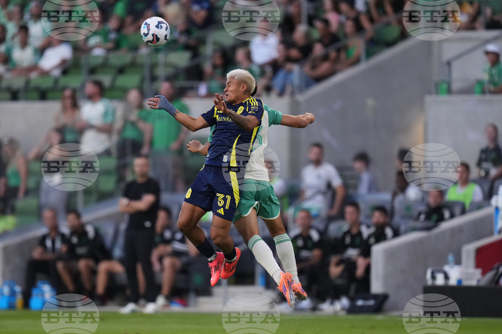 Austin FC defender Julio Cascante (18) heads the ball past Nashville SC forward Jacob Shaffelburg (14) during the first half of an U.S. Open Cup final soccer match in Austin, Texas, Wednesday, Oct. 1, 2025. (AP Photo/Eric Gay)