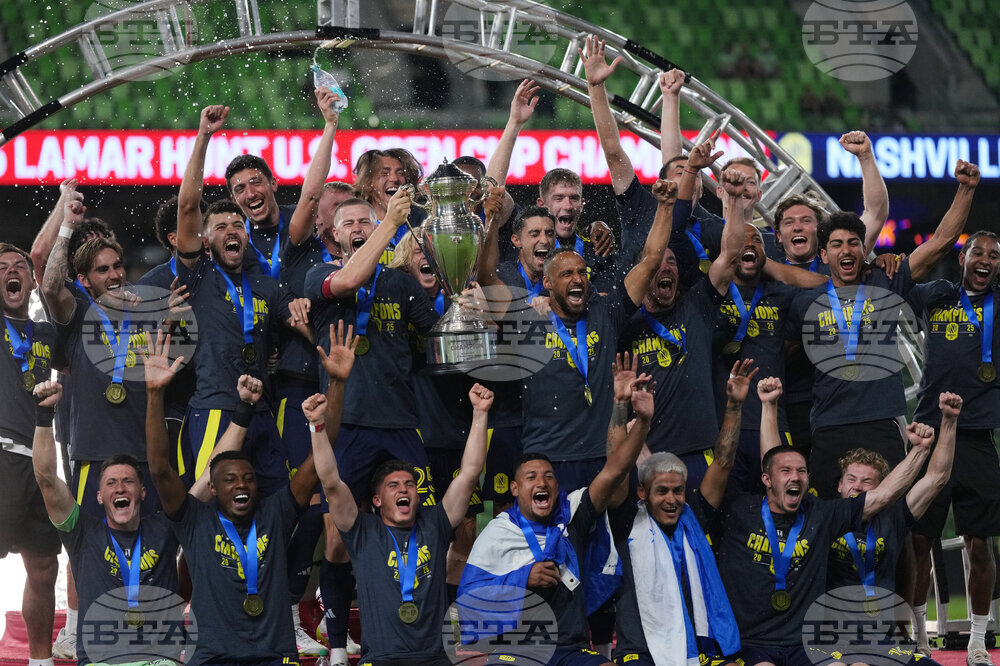 Nashville SC players celebrate their win over Austin FC in an U.S. Open Cup final soccer match in Austin, Texas, Wednesday, Oct. 1, 2025. (AP Photo/Eric Gay)
