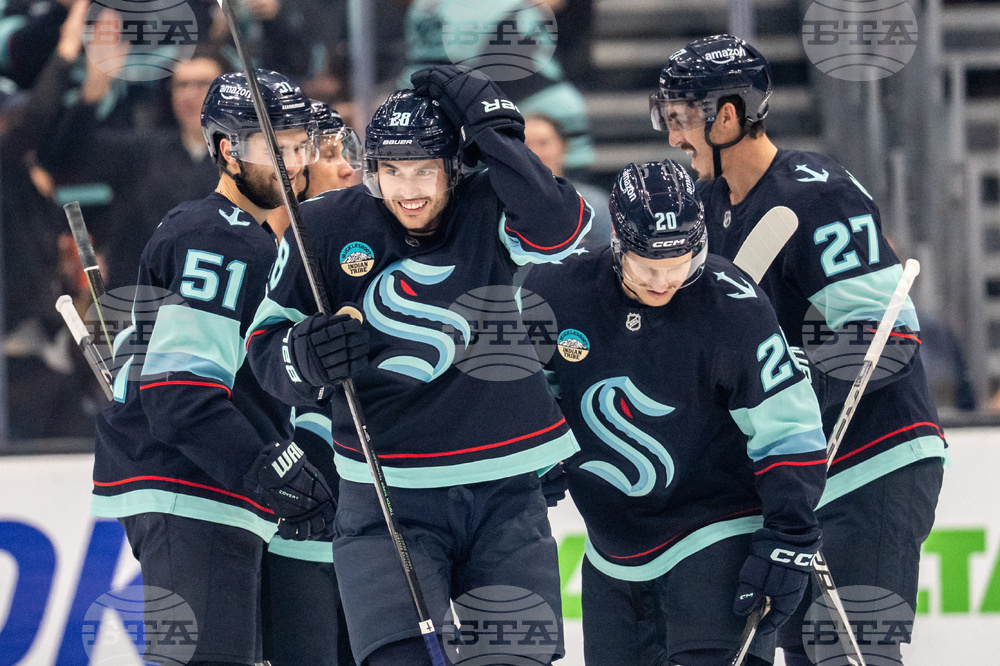 Seattle Kraken defenseman Joshua Mahura (28) celebrates with forward Shane Wright (51), forward Eeli Tolvanen (20) and forward Mason Marchment (27) after scoring a goal during the first period of an NHL preseason hockey game against the Edmonton Oilers, Wednesday, Oct. 1, 2025, in Seattle. (AP Photo/Stephen Brashear)