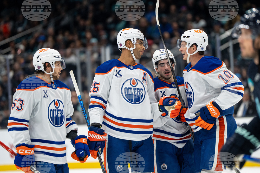 Edmonton Oilers, from left, forward Isaac Howard, defenseman Darnell Nurse, forward Matt Savoie and forward Trent Frederic celebrate a goal during the first period of an NHL preseason hockey game against the Seattle Kraken, Wednesday, Oct. 1, 2025, in Seattle. (AP Photo/Stephen Brashear)