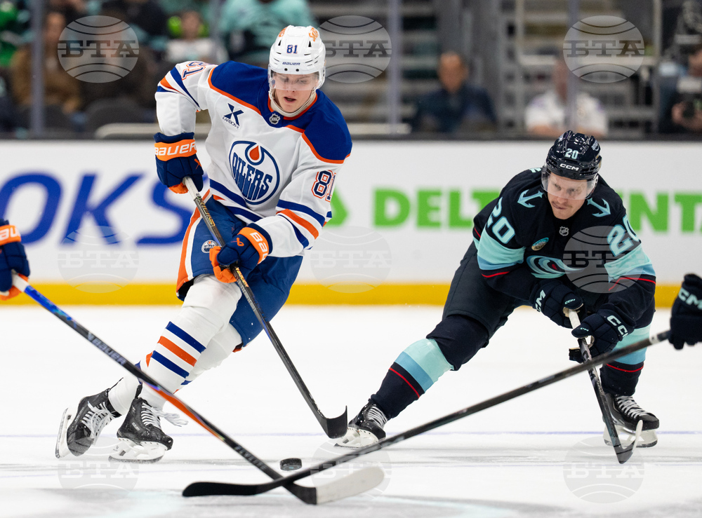 Edmonton Oilers forward Josh Samanski (81) skates against Seattle Kraken forward Eeli Tolvanen (20) during the first period of an NHL preseason hockey game, Wednesday, Oct. 1, 2025, in Seattle. (AP Photo/Stephen Brashear)