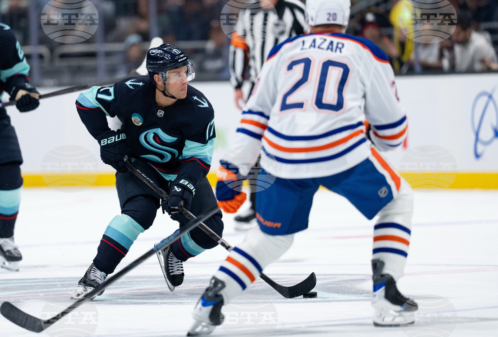 Seattle Kraken forward Jaden Schwartz (17) skates against Edmonton Oilers forward Curtis Lazar (20) of an NHL preseason hockey game, Wednesday, Oct. 1, 2025, in Seattle. (AP Photo/Stephen Brashear)