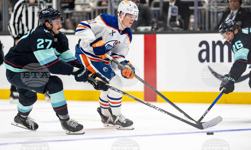 Seattle Kraken forward Eeli Tolvanen, left, checks Edmonton Oilers forward Kasperi Kapanen, center, in front of Seattle Kraken defenseman Ryan Lindgren during the third period of an NHL preseason hockey game, Wednesday, Oct. 1, 2025, in Seattle. (AP Photo/Stephen Brashear)