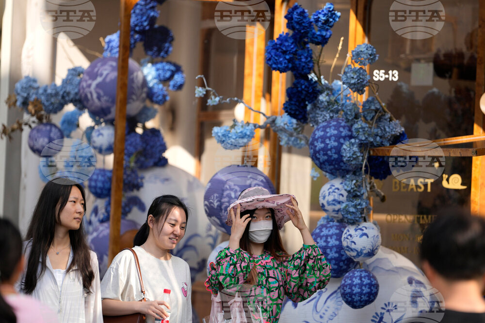 Women walk past a flower shop at a trendy shopping district during the National Day holidays in Beijing, China, Thursday, Oct. 2, 2025. (AP Photo/Ng Han Guan)