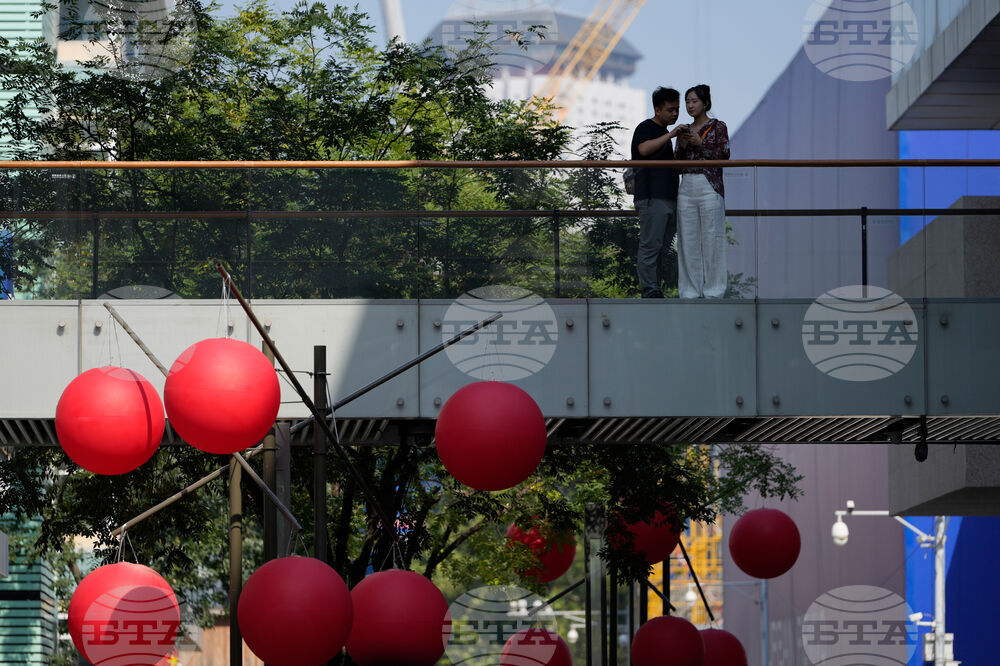 Shoppers stand on a bridge over a trendy shopping district during the National Day holidays in Beijing, China, Thursday, Oct. 2, 2025. (AP Photo/Ng Han Guan)