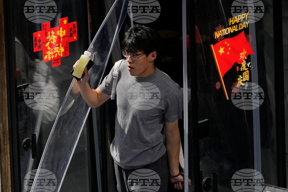 A man leaves a restaurant with decals on its door marking China's National Day and mid-autumn festival at a trendy shopping district during the National Day holidays in Beijing, China, Thursday, Oct. 2, 2025. (AP Photo/Ng Han Guan)